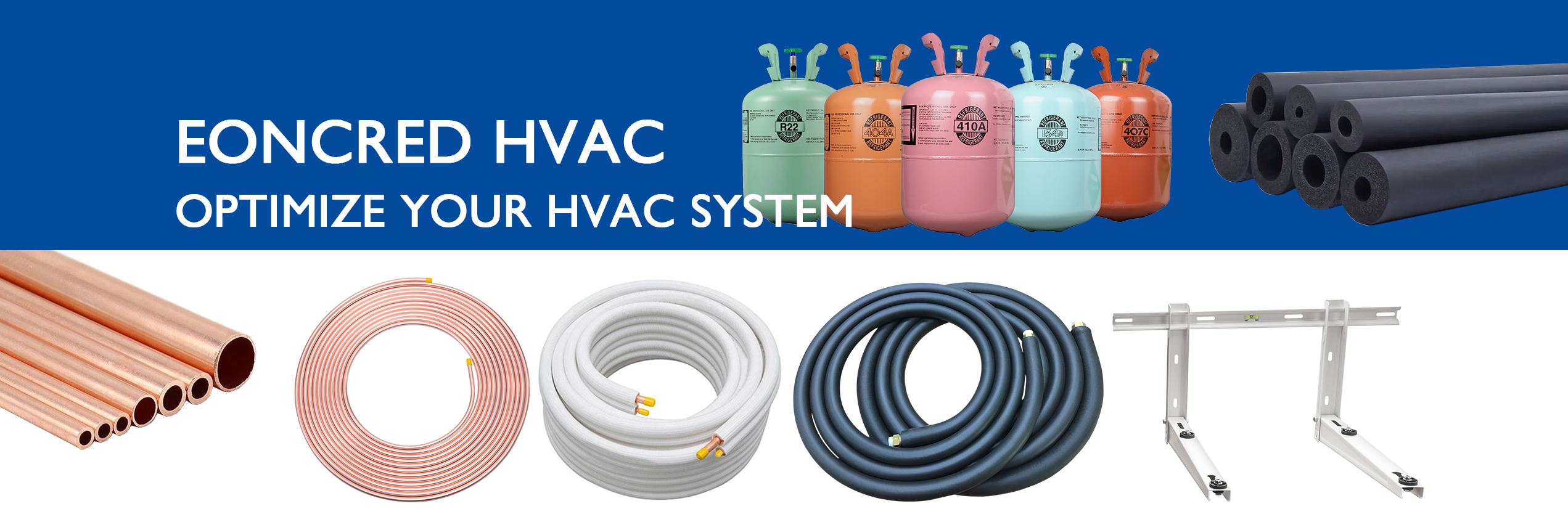 Full lineup of HVAC installation materials, including refrigerants, copper tubes, fittings, Y Branch, AC brackets, PVC floor stand, PVC Ducts, installation tolls and other accessories.